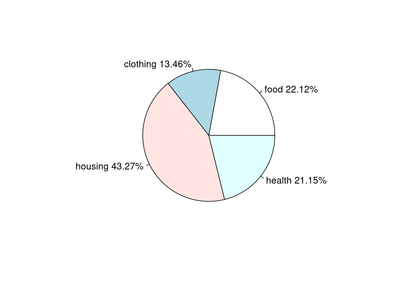 food 22.12% clothing 13.46% housing 43.27% health 21.15%